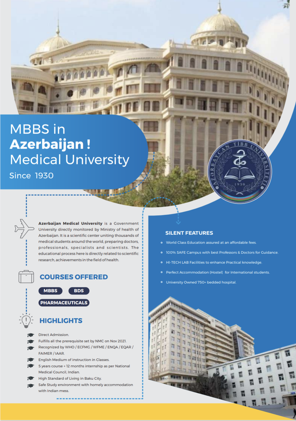 Azerbaijan Medical University (AMU) founded in 1930, is one of the largest and most prestigious higher educational establishments in the country. There are 5 faculties which include: General Medicine, Medical Prophylactics, Dentistry, Military Medicine, Pharmaceutic.